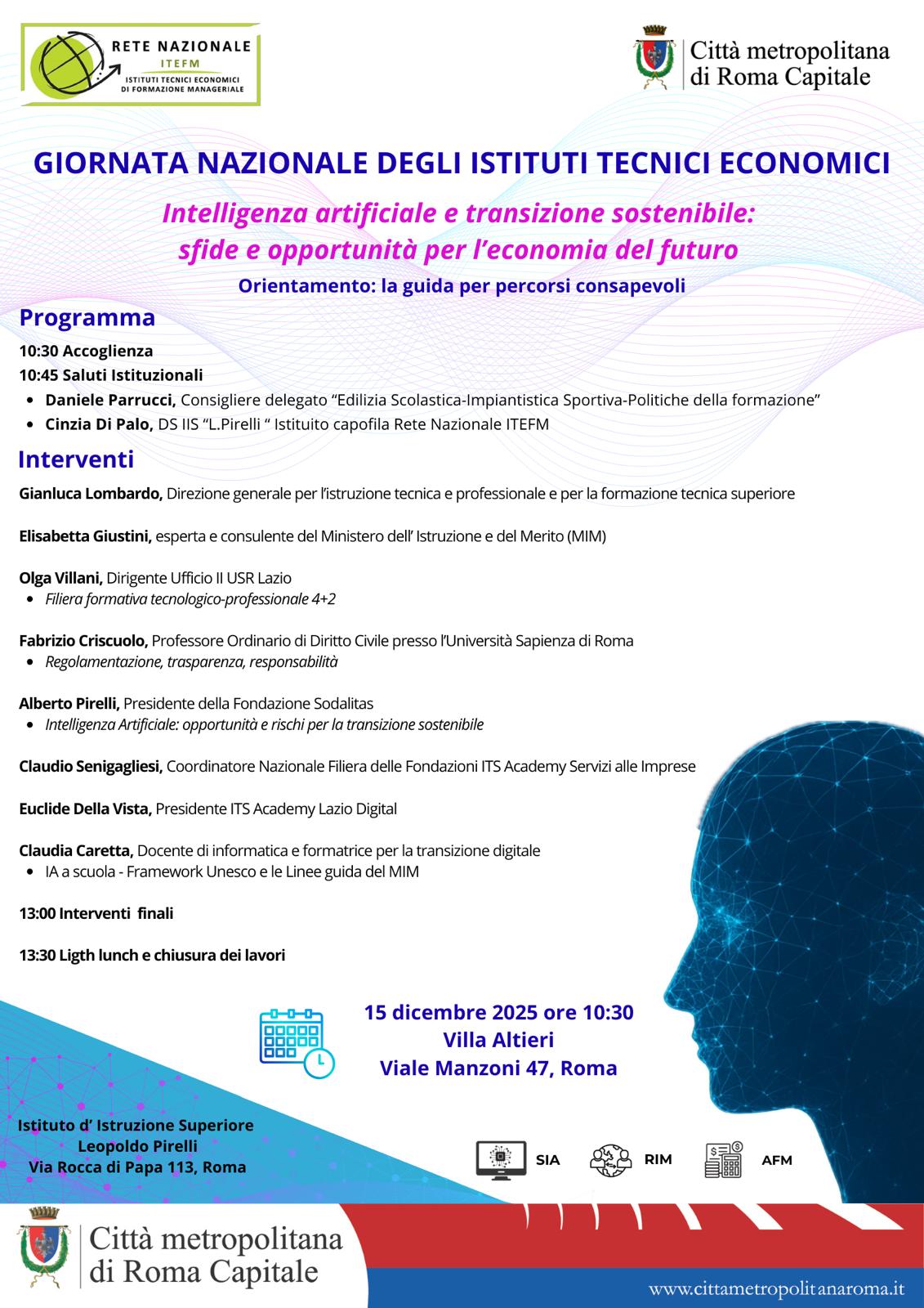 Lunedì 15 dicembre 2025, alle ore 10:30 presso Villa Altieri, a Roma, si è svolto l’evento annuale organizzato dalla rete ITEFM “La Giornata Nazionale degli Istituti Tecnici Economici”, per un focus di approfondimento dal titolo: Intelligenza artificiale e transizione sostenibile: sfide e opportunità per l’economia del futuro.